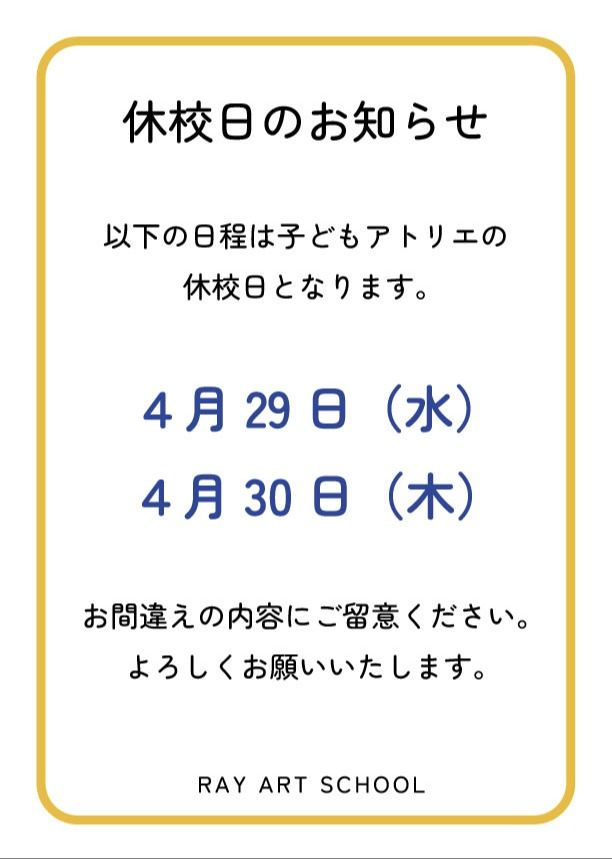 子どもアトリエ休校日のお知らせをいたします。
